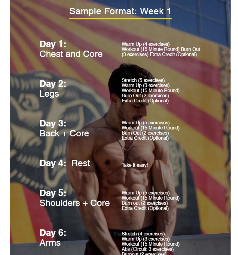 The workouts are structured starting with a dynamic warm-up, then a 15 minute circuit of various exercises followed by a burnout with reps and sets. Each day targets a different muscle group. There's even an extra credit portion if you want to push yourself that extra mile!